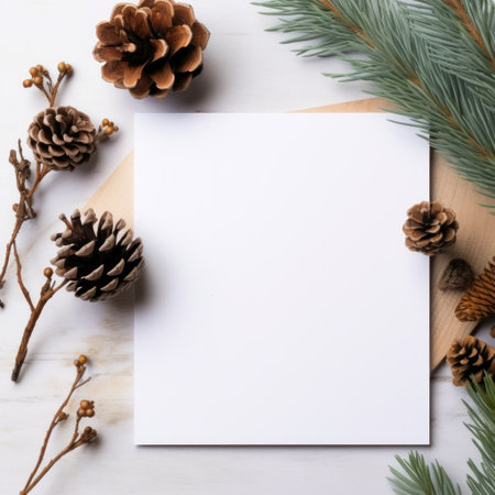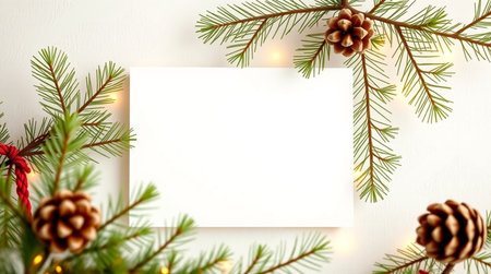 Christmas greeting card mockup with fir branches and pine cones on white wooden background.
