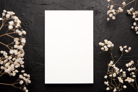 Card mockup, blank wedding invitation with white floral decor on black background. Greeting card mockup with dried flowers on stone table