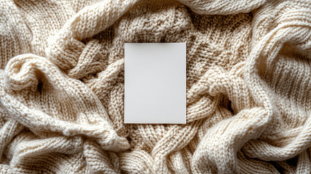 Minimalist mockup of a blank greeting card on a soft beige textile blanket. Template for showcasing invitation design, wedding stationery, holiday greetings, birthday cards, and Christmas celebration messages.