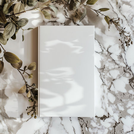 artificial branch with sheets of paper on marble backdrop, mockup for text and banner, background for wedding or funeral invitation