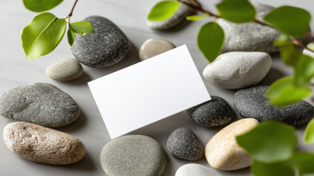 Paper card mock-up, minimalist modern still life composition with a piece of stone and dry palm leaf. Eco materials