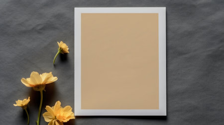 Blank white paper card with dried flowers on it, flat lay workspace concept with copy space, top view photo