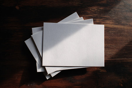A pristine stack of blank white cards sits on a dark, polished wooden desk, bathed in soft light. Each empty sheet represents a new idea or a fresh start, waiting for inspiration.