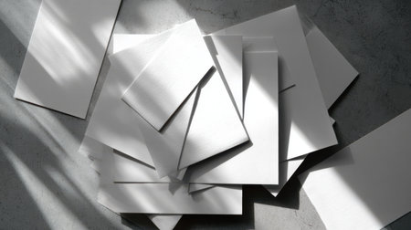 Neatly fanned out stack of blank white cards on a grey concrete background with sharp, geometric shadows