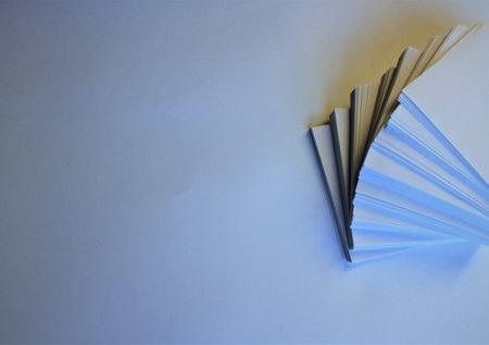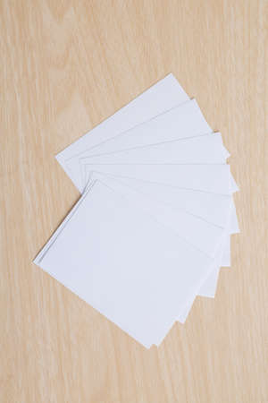 High-angle view of a fan stack of business cards on a white textured paper background, minimalistic design