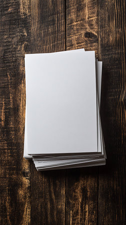 Overhead shot showcasing a stack of pristine white paper sheets on a richly textured, dark brown wooden tabletop. Ideal for mockups, invitations, or stationary designs.