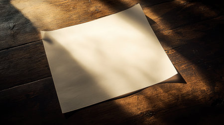 A blank sheet of paper on a dark wooden desk with a single light source casting a shadow for a dramatic effect. -