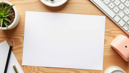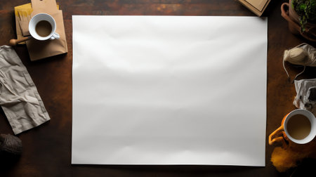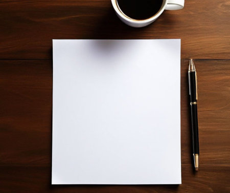 A clean sheet of paper lies on a rustic wooden table accompanied by a coffee cup and writing tools, ideal for creativity.