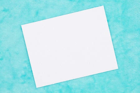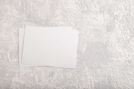 White paper business card, mockup on gray concrete background. Blank, flat lay, top view, still life, copy space.