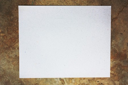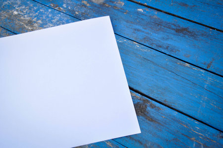 Top view of a blank sheet of white paper lying on a textured wooden rustic desk with dark edges of the image.
