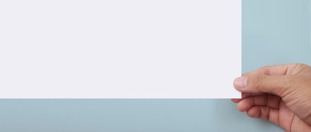 Hands holding blank paper sheet on dark background, top view. Mockup for design.