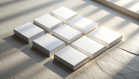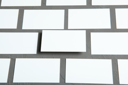 Neatly fanned out stack of blank white cards on a grey concrete background with sharp, geometric shadows