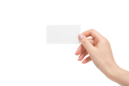 Close-up of woman's hand isolated on white background, holding an empty card.