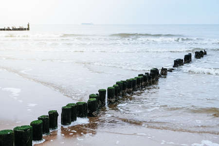 Seaweed covers old weathered wooden poles of sea protection barriers along the coast of the Netherlands