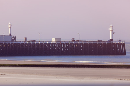 The cliff and the pier with lighthouse for big ships in Ostend, Belgium.