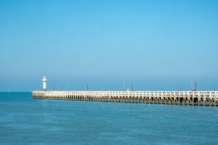 A tall, tranquil lighthouse stands firmly on a pier, guiding sailors across peaceful and calm waters all day long