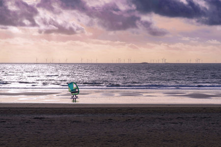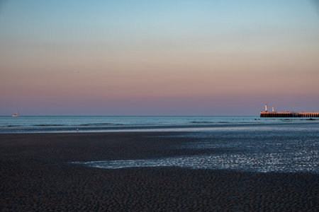 North Sea beach at sunset. Town Blankenberge, West Flanders, Belgium