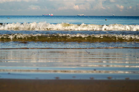 A beautiful view of a beach with splashing sea waves in Hague city, the Netherlands