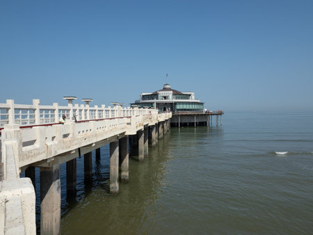 The only pier in Belgium, with sandy beach. Blankenberge, West Flanders, Belgium, Europe.