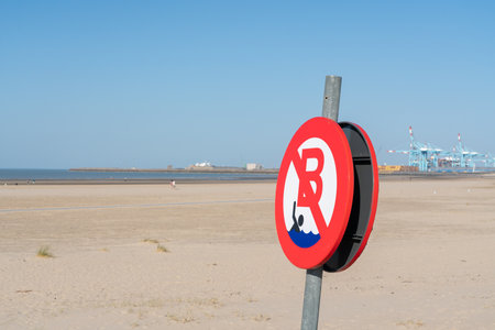 A round sign with No swimming in the sea