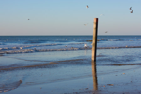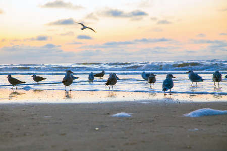 Seagulls on the shores of the north sea. North Sea at sunset.