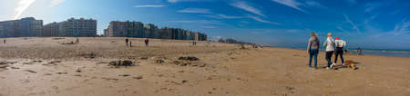 People walking on the sand beach near the sea with a lot of houses and hotel in the evening. Sand, relax and sunset in Ostend, Belgium.
