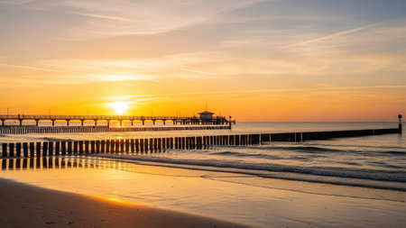 Serene beach scene at sunset with colorful beach huts aligned by the shore and a wooden pier leading to the tranquil sea. the sky is adorned with clouds, showcasing a mix of warm hues from the setting sun. perfect for travel posters and summer vacation themes.