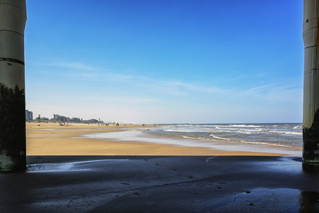 Breathtaking detail of colorful pillars under the Pier at Scheveningen, The Netherlands. The Pier and The Ferris Wheel at Scheveningen. Concrete bridge pillar view for construction