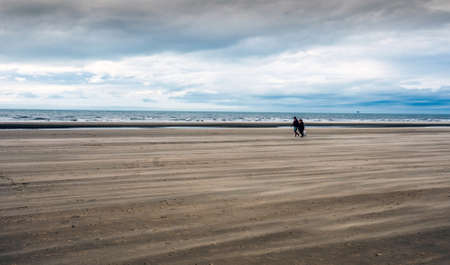 A couple walk along windswept Formby Beach near Southport, UK.