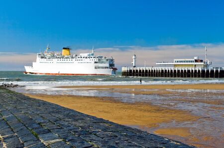 The image of the pier, where a big ship sailing from Ostend.