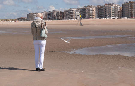 A woman stands with her back and feeds a seagull on a sandy beach in Ostend,residential buildings are visible in the distance