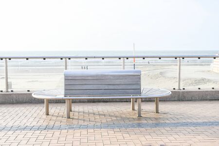 Empty wood bench install on cement floor near beach with background blur white sand ,sea and white sky.