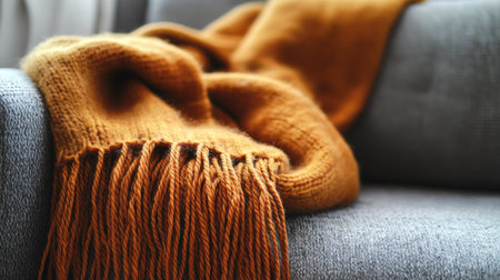 A cozy warm knitted blanket in earthy tones is gracefully draped over a gray sofa, creating an inviting atmosphere perfect for relaxation and comfort at home.
