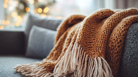 A cozy hand-knitted blanket adds warmth and texture to a soft gray couch, enhancing the inviting atmosphere of a stylish living room with festive decor.