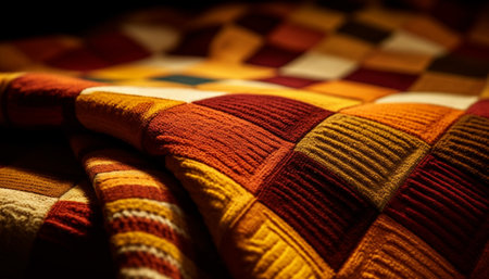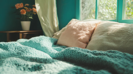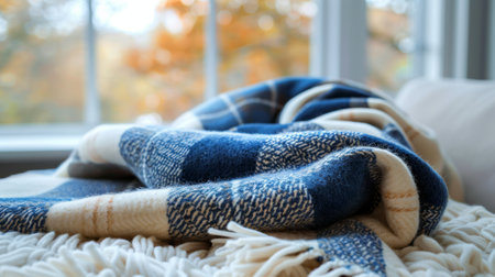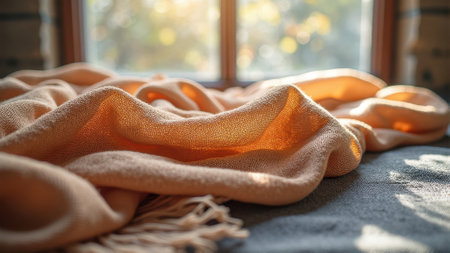 Cozy sunlit blanket on bed with autumn light. That the image is generated using AI.