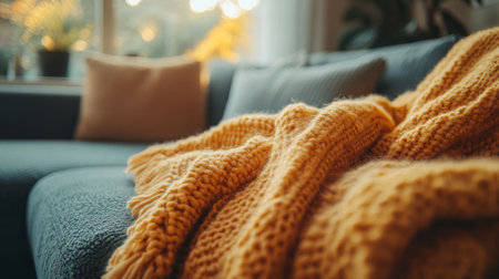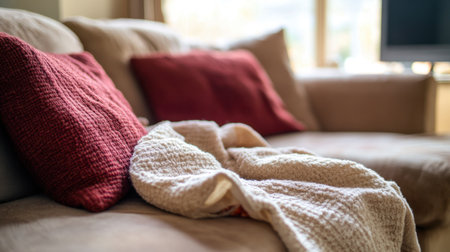 A warm and inviting living room scene featuring a soft blanket draped over a cozy sofa with decorative cushions, perfect for creating a peaceful home atmosphere.