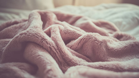 A soft pink fleece blanket drapes over a bed, inviting comfort and warmth. Its texture and cozy appearance enhance the serene atmosphere ideal for relaxation.