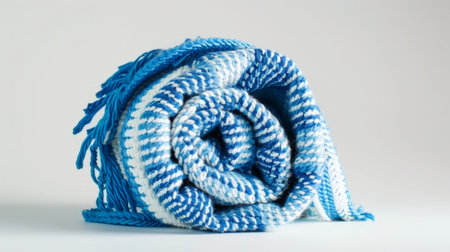 rolled up blue and white beach towel on a white background