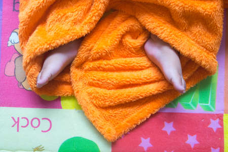 Lovely infant foot in orange blanket, close up