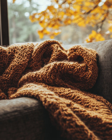 Fluffy autumn throw, chunky knit, laid on a sofa, deep fall colors of brown and orange