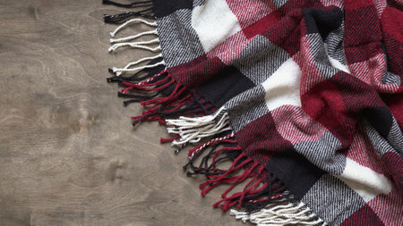 Texture of a woolen red-black-white plaid in a cage, close-up of fabric, winter textile with fringes on a wooden background, copy space.Tartan fabric.Checkered pattern.
