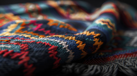 Colorful geometric textile pattern with zigzag designs and intricate weaving.