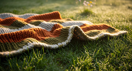 A cozy, striped knitted blanket in earth tones lies on fresh green grass covered in morning dew. The warm sunlight creates a peaceful outdoor scene, suggesting a picnic or a relaxing start to the day in nature.