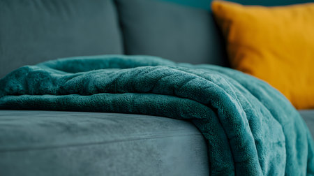 A plush teal blanket cascades over a sleek couch, accentuated by a vibrant orange pillow to create warmth. The inviting environment promises relaxation and comfort for anyone nearby.