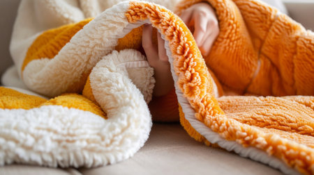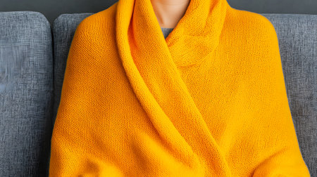 A person wrapped in a vibrant orange blanket sits comfortably, conveying warmth and relaxation on a gray sofa. The serene atmosphere invites peaceful moments of rest and comfort.