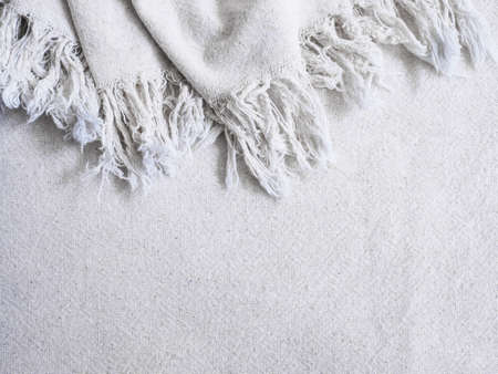 Close up beige cotton fabric texture with fringe edge. Natural vintage textile background..
