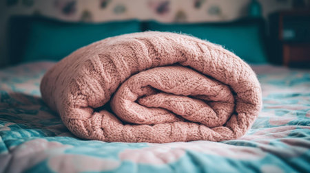 A cozy pink knit blanket beautifully rolled on a bed, adding warmth and style to the interior. Perfect for creating a serene and inviting atmosphere.