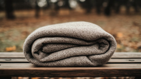 A neatly folded light cotton blanket in a neutral tone on a wooden bench, natural light enhancing the soft texture, HD quality --chaos 30 --ar 16:9 --v 6.1 Job ID: 478888fd-ad5e-4e32-9514-e2a0e56ce278