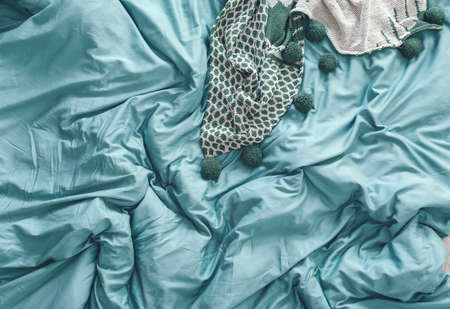Messy bedding. Soft fabric background. Comfy softness of warm unmade bed. Sleep relaxation and coziness.