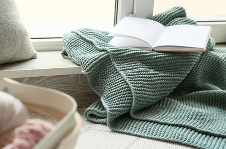 Book with knitted plaid near window
